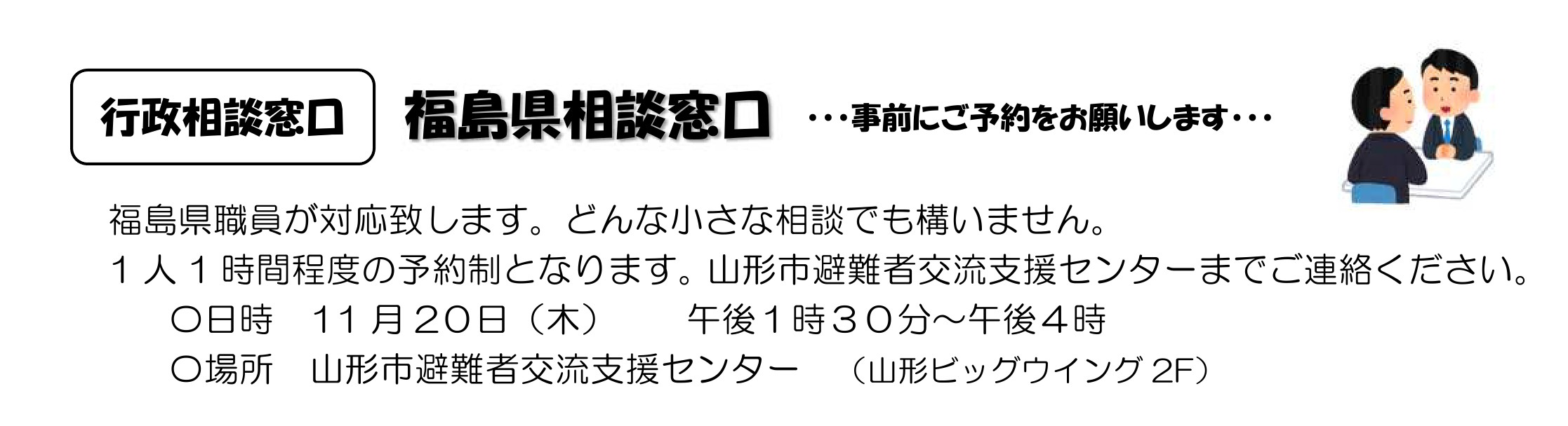 村山地域 被災者向け 避難者向け 2025年 11月 20日(木曜日) 13:30~ 福島県相談窓口 主催:福島県避難者支援課 場所:山形市避難者交流支援センター(山形国際交流プラザ ビッグウィング2階) お問い合わせ 山形市避難者交流支援センター TEL:080-2807-7591 添付ファイル