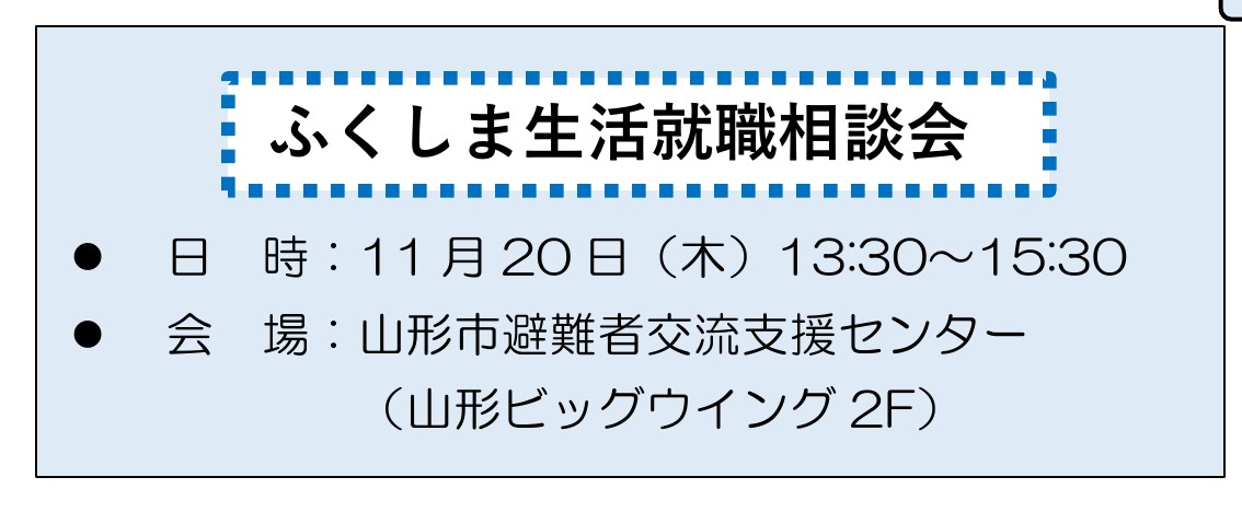 村山地域 被災者向け 避難者向け 2025年 11月 20日(木曜日) 13:30~ ふくしま生活就職相談会 主催:ふくしま生活・就職応援センター 郡山事務所 場所:山形市避難者交流支援センター(山形国際交流プラザ ビッグウィング2階) 個別相談で対応いたします。お気軽にお越しください。 事前にお申込みいただくと、より良い情報をご提供できます。 詳しくはこちら⇒ふくしま生活・就職応援センター お問い合わせ 山形市避難者交流支援センター TEL:080-2807-759 添付ファイル