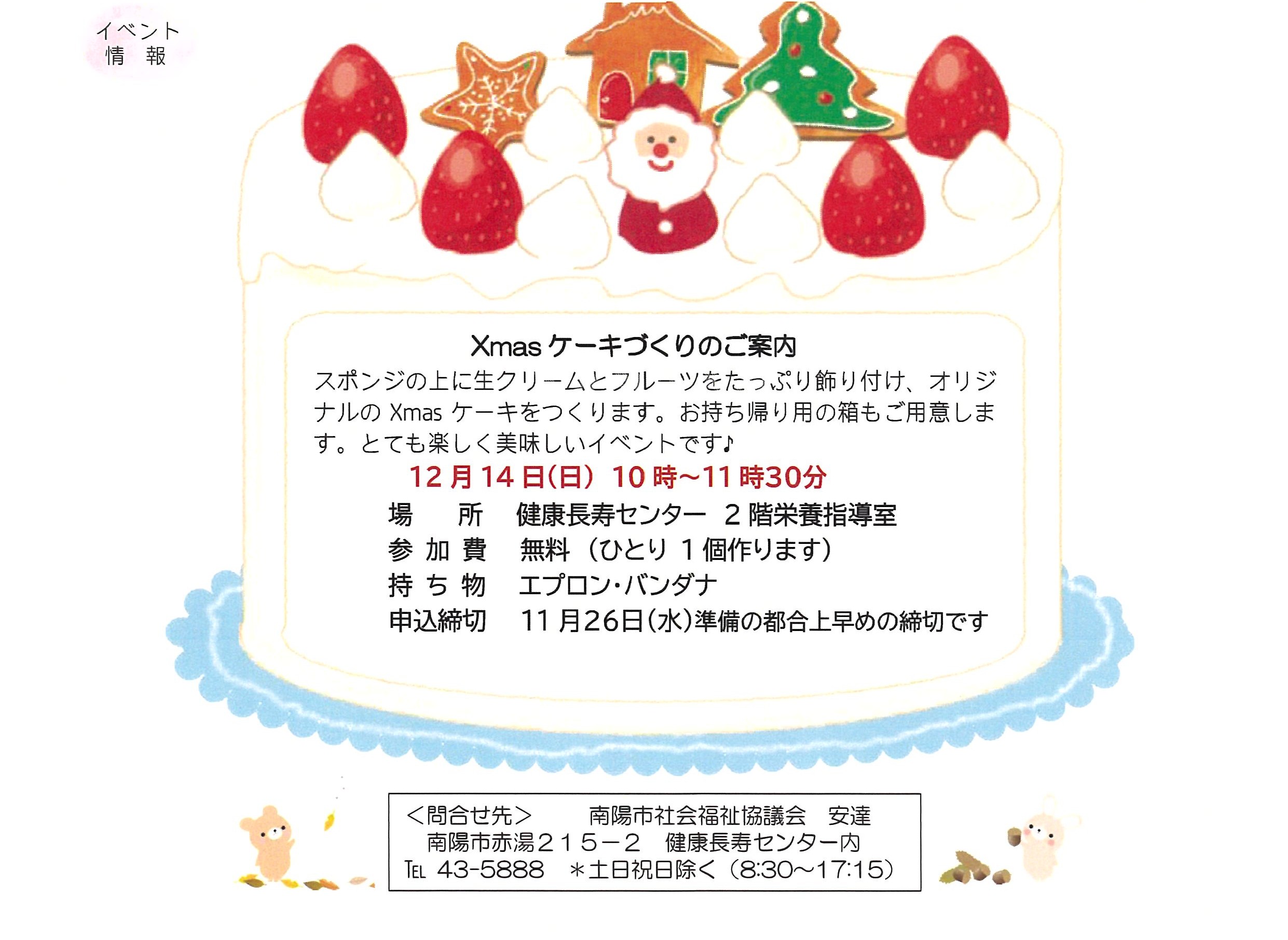 置賜地域 被災者向け 避難者向け 支援者向け 2025年 12月 14日(日曜日) 10:00~ 南陽市社協 Xmasケーキづくり 主催:南陽市社会福祉協議会 場所:健康長寿センター 2階栄養指導室 お問い合わせ 南陽市社会福祉協議会(安達) TEL:0238-43-5888 添付ファイル
