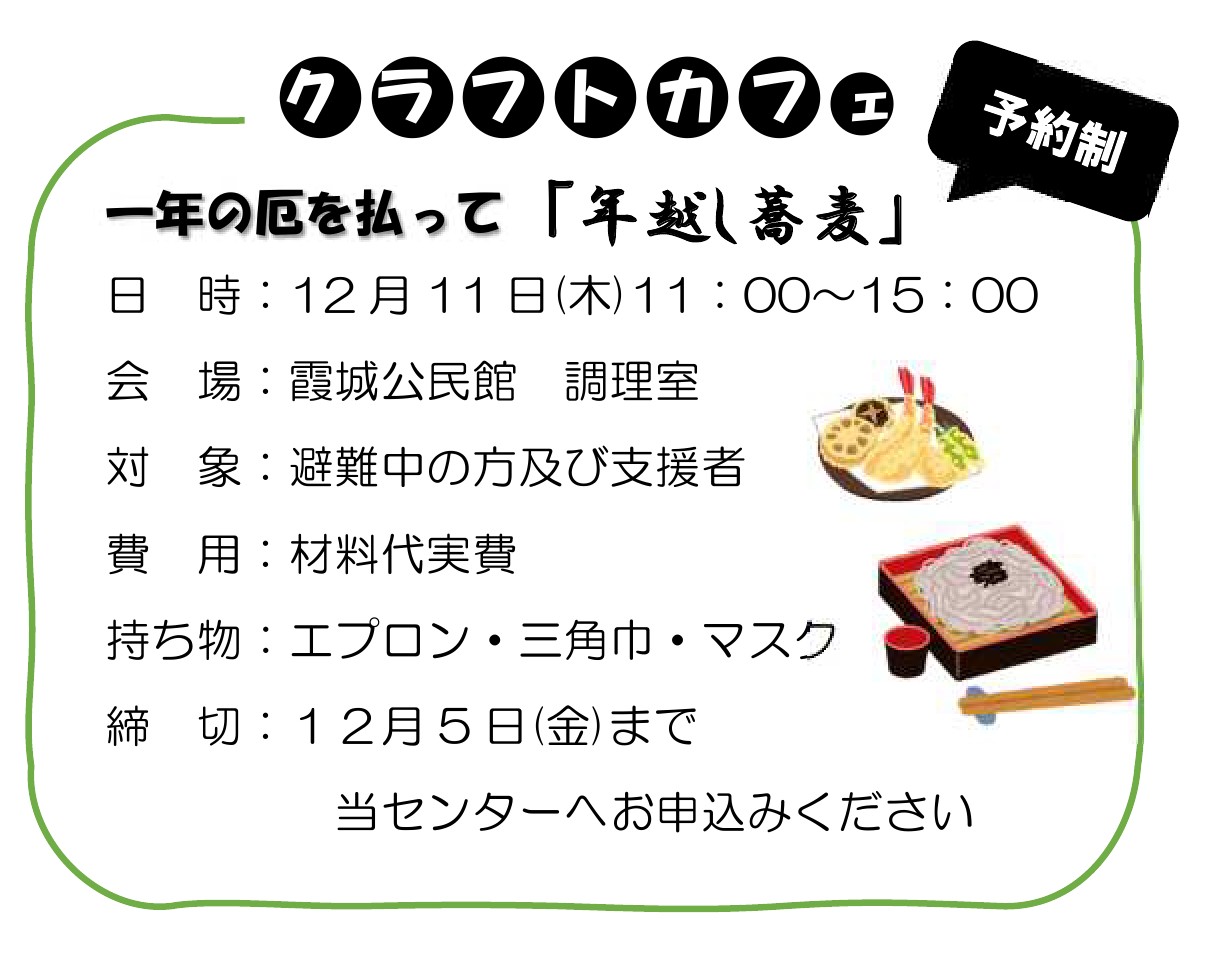 村山地域 被災者向け 避難者向け 支援者向け 2025年 12月 11日(木曜日) 11:00~ クラフトカフェ 年越し蕎麦 主催:山形市避難者交流支援センター 場所:霞城公民館 調理室 お問い合わせ 山形市避難者交流支援センター TEL:080-2807-7591 添付ファイル