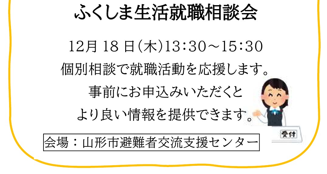 村山地域 被災者向け 避難者向け 2025年 12月 18日(木曜日) 13:30~ ふくしま生活就職相談会 主催:ふくしま生活・就職応援センター 郡山事務所 場所:山形市避難者交流支援センター(山形国際交流プラザ ビッグウィング2階) お問い合わせ 山形市避難者交流支援センター TEL:080-2807-759 添付ファイル