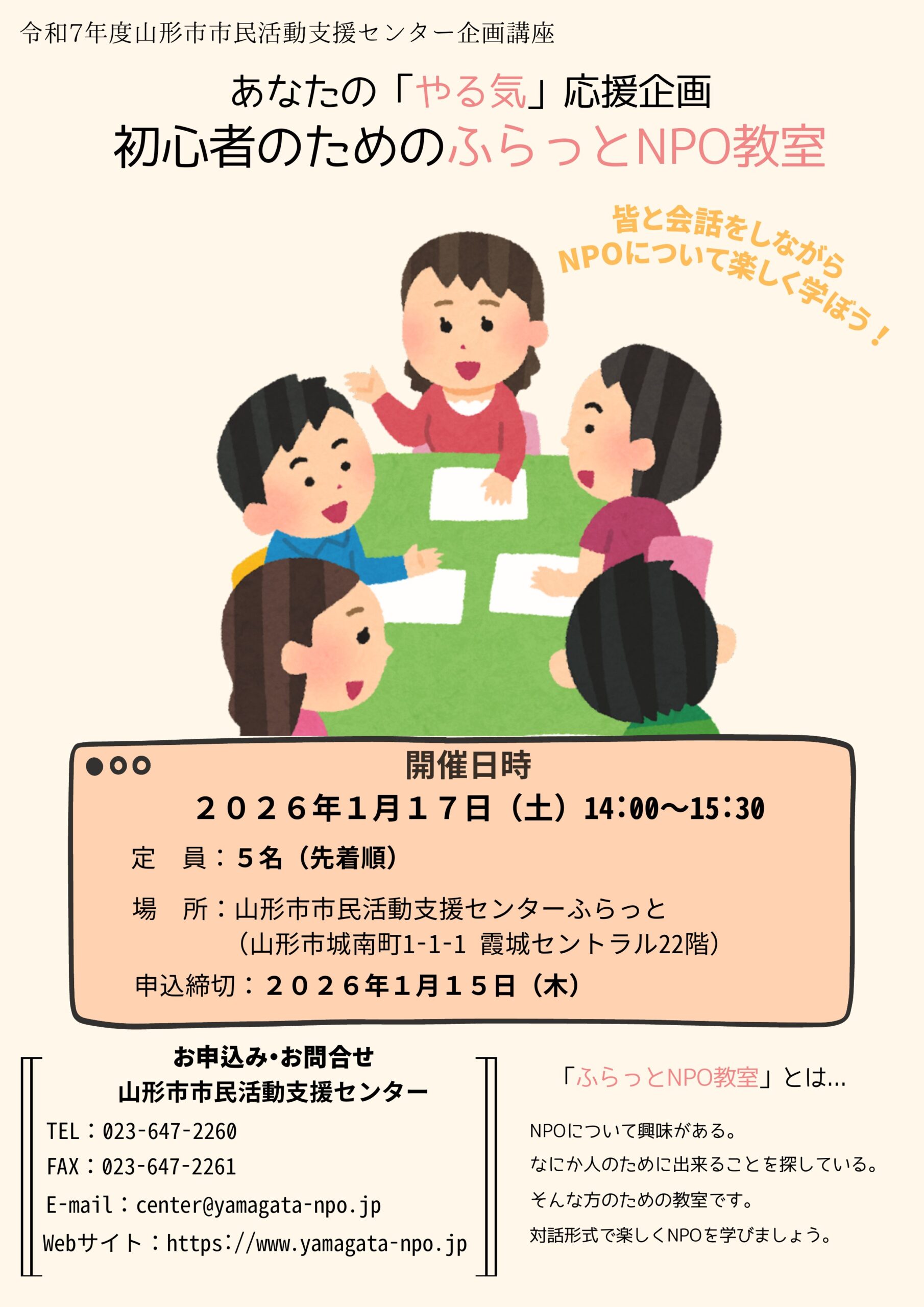 村山地域 支援者向け 2026年 1月 17日(土曜日) 14:00~ 初心者のためのふらっとNPO教室 主催:山形市市民活動支援センター 場所:山形市市民活動支援センターふらっと(山形市霞城セントラル22階) ● お車での来館を予定している方は、霞城セントラル駐車場、または山形駅東口交通センター駐車場をご利用ください。講座時間分の駐車券の補助があります。 ★山形市市民活動支援センターホームページ★ お問い合わせ 山形市市民活動支援センター TEL:023-647-2260 添付ファイル NPO教室チラシ 申込書