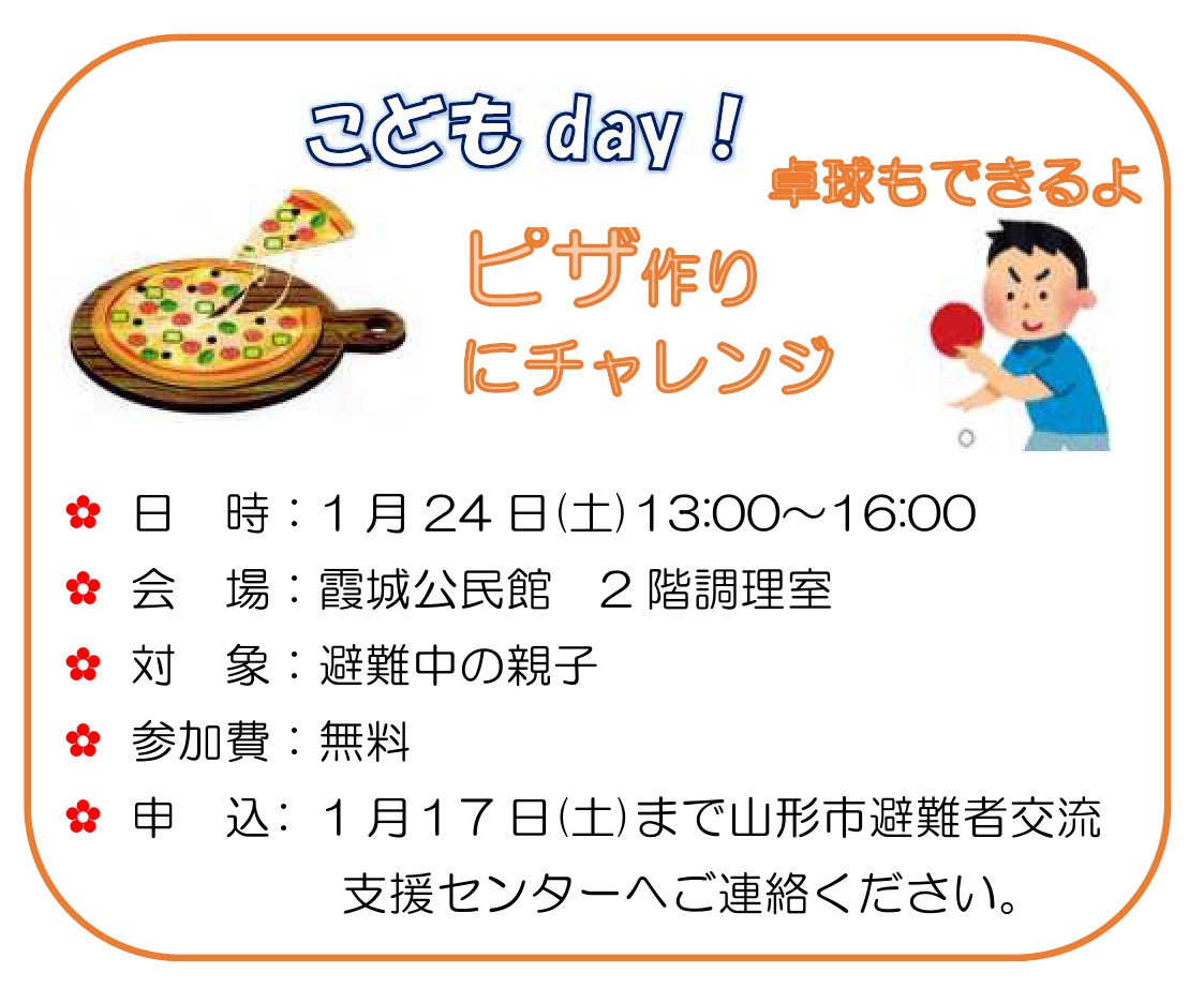 村山地域 被災者向け 避難者向け 支援者向け 2026年 1月 24日(土曜日) 13:00~ こどもday!ピザ作りにチャレンジ! 主催:山形市避難者交流支援センター 場所:霞城公民館 2階調理室 お問い合わせ 山形市避難者交流支援センター TEL:080-2807-7591 添付ファイル