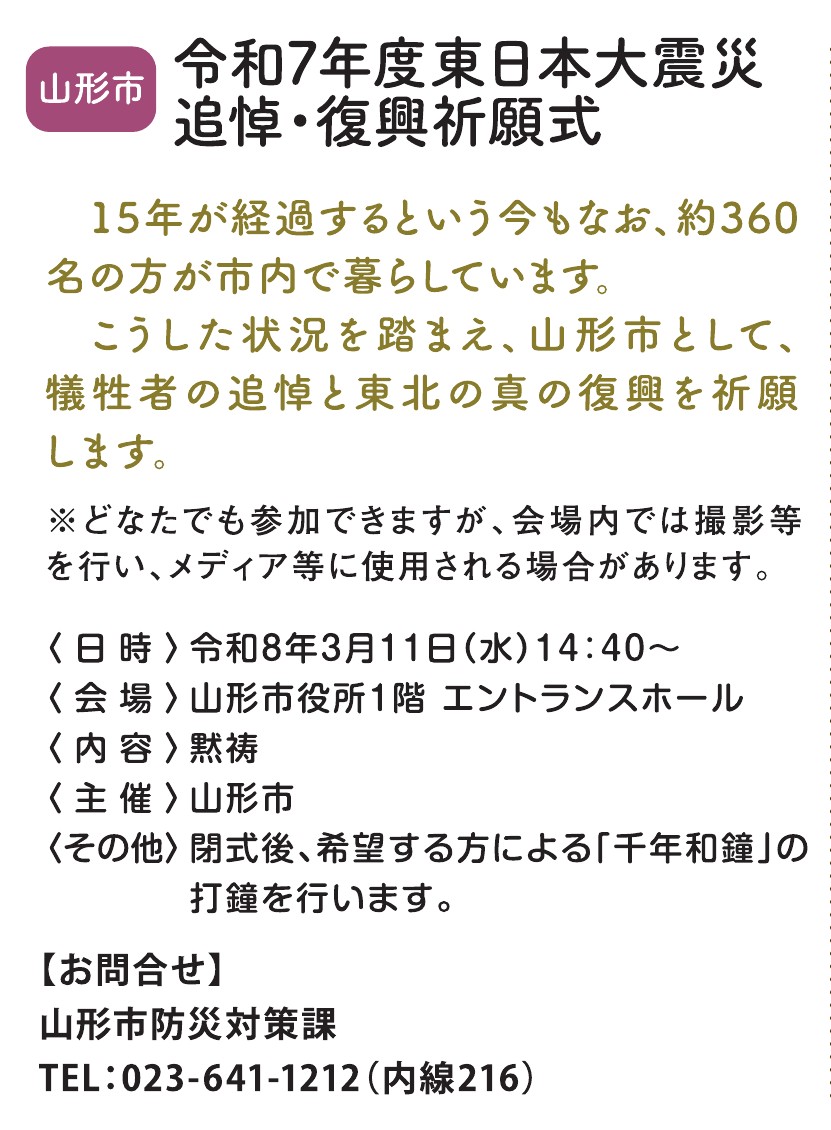 村山地域 その他全般 2026年 3月 11日(水曜日) 14:40~ 【山形市】令和7年度東日本大震災 追悼・復興祈願式 主催:山形市 場所:山形市役所 お問い合わせ 山形市防災対策課 TEL:023-641-1212(内線216) 添付ファイル