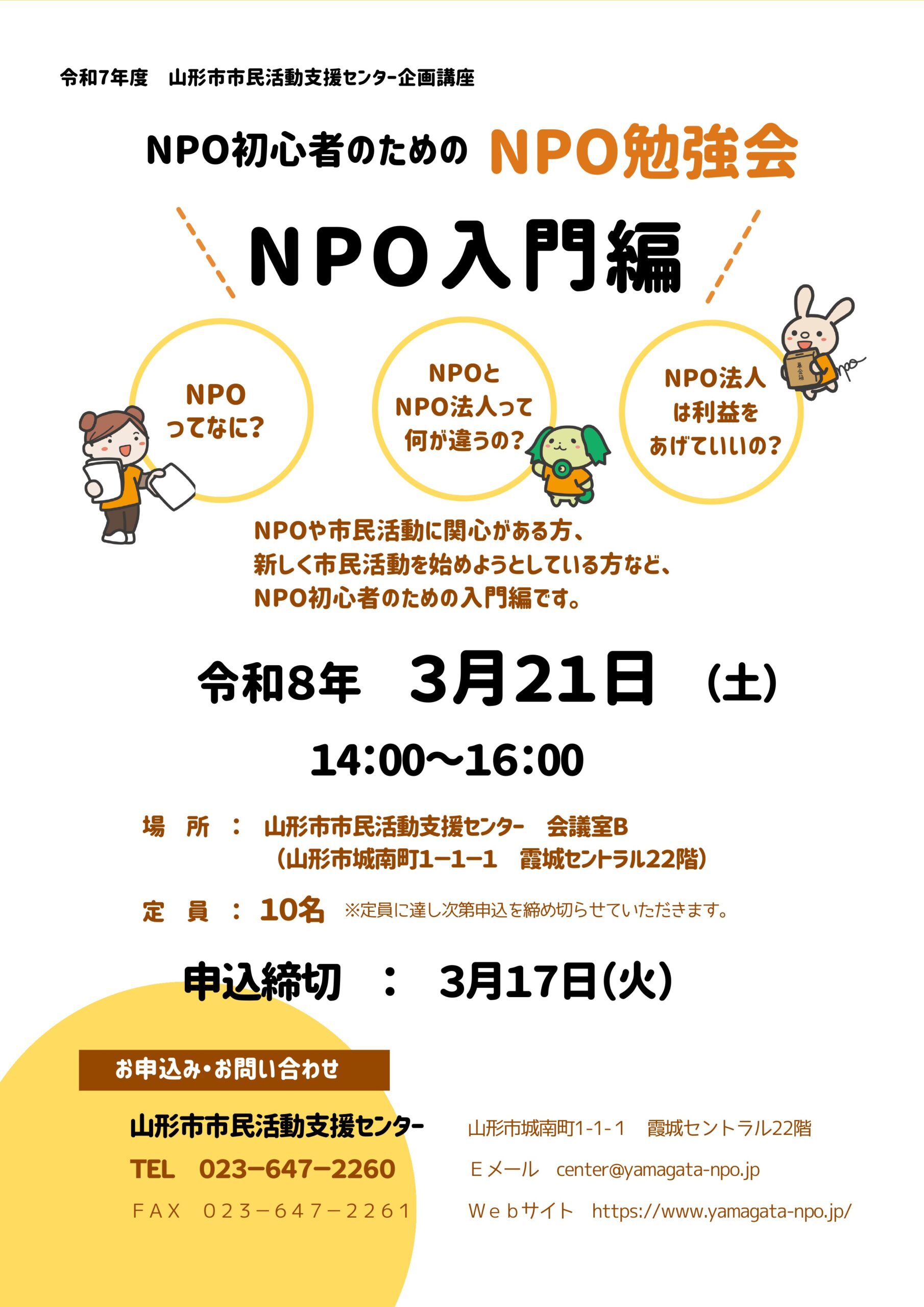 村山地域 支援者向け 2026年 3月 21日(土曜日) 14:00~ NPO初心者のためのNPO勉強会~入門編~ 主催:山形市市民活動支援センター 場所:山形市市民活動支援センター(霞城セントラル22階) お問い合わせ 山形市市民活動支援センター TEL:023-647-2260 添付ファイル NPO勉強会チラシ・申込書