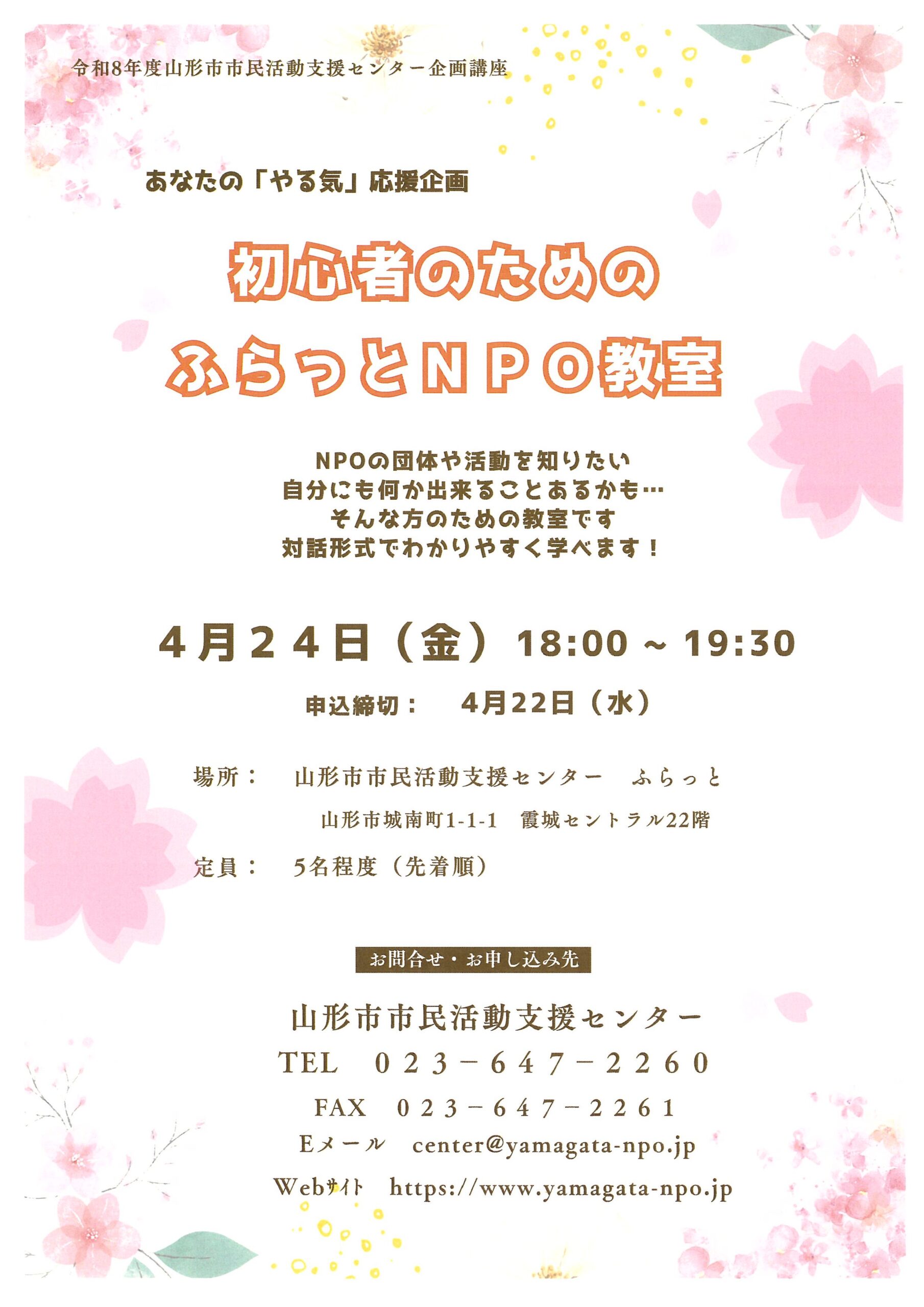 村山地域 支援者向け 2026年 4月 24日(金曜日) 18:00~ 初心者のためのふらっとNPO教室 主催:山形市市民活動支援センター 場所:山形市市民活動支援センター(霞城セントラル22階) お問い合わせ 山形市市民活動支援センター TEL:023-647-2260 添付ファイル チラシ 申込書