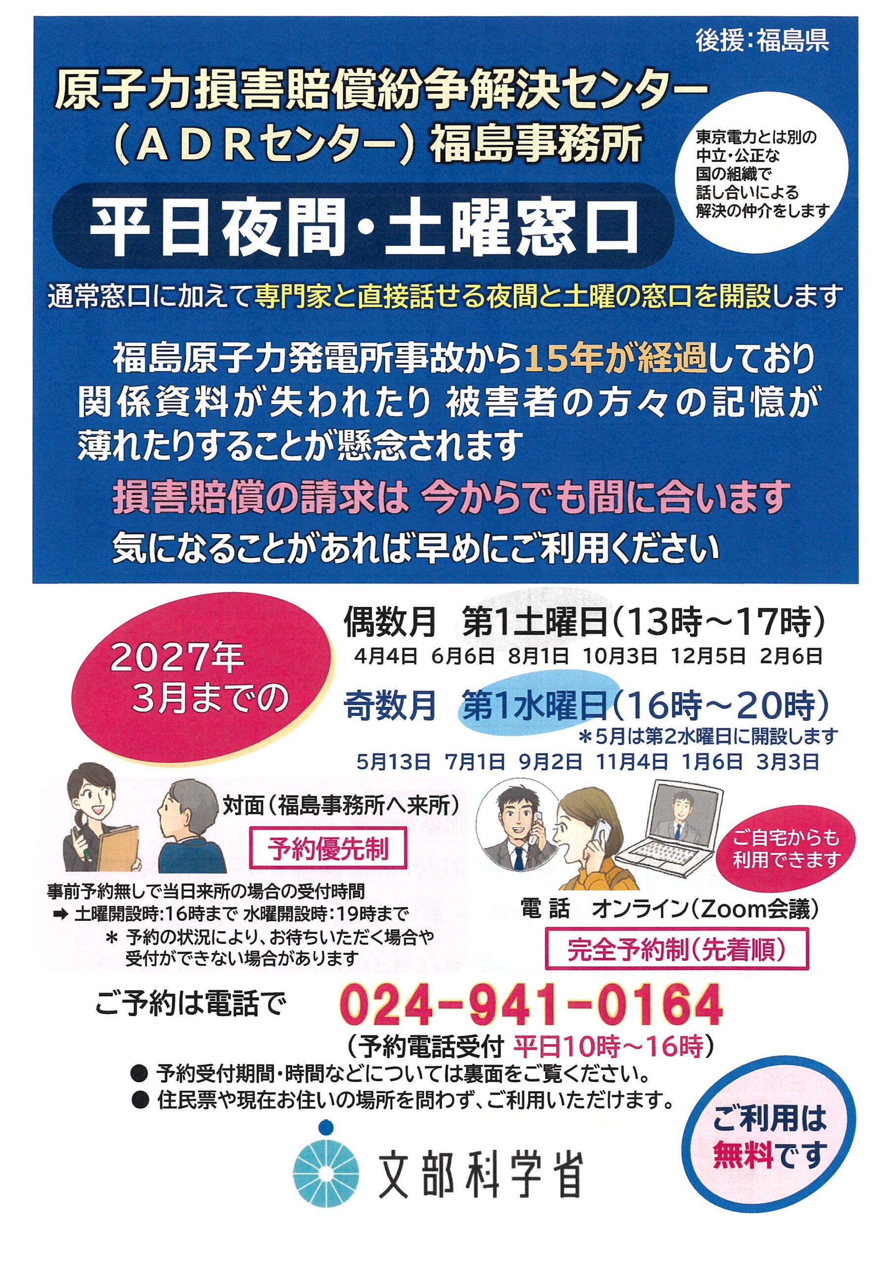 原子力損害賠償紛争解決(ADR)センターでは、4月より月1回、偶数月に土曜窓口、奇数月に平日夜間窓口を開設してお話を伺います。