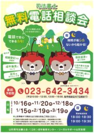 2025年 10月 9日 山形国際ドキュメンタリー映画祭 会場: 令和7年10月9日(木)~16日(木)まで、山形国際ドキュメンタリー映画祭が開催されます。 東日本大震災が起きてから14… このイベントを見る 2025年 10月 16日 司法書士 無料電話相談会 会場: 借金のこと、不動産のこと、日常のトラブル…司法書士に相談してみませんか? 何を相談していいか分からないという方も、まずご… このイベントを見る