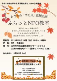 2025年 10月 24日 初心者のためのふらっとNPO教室 会場: ● お車での来館を予定している方は、霞城セントラル駐車場、または山形駅東口交通センター駐車場をご利用ください。講座時間分… このイベントを見る