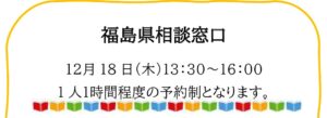 2025年 12月 18日 福島県相談窓口 会場: このイベントを見る 2025年 12月 18日 ふくしま生活就職相談会 会場: このイベントを見る 2025年 12月 18日 司法書士 無料電話相談会 会場: 借金のこと、不動産のこと、日常のトラブル…司法書士に相談してみませんか? 何を相談していいか分からないという方も、まずご… このイベントを見る