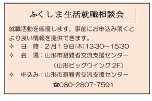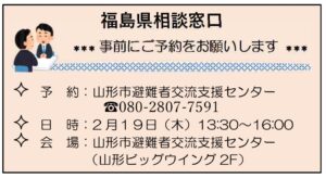 2026年 2月 19日 福島県相談窓口 会場: 福島県職員が対応いたしますので、お気軽にお越しください。 どんな小さな事でも構いません。 1人1時間程度の予約制となりま… このイベントを見る 2026年 2月 19日 ふくしま生活就職相談会 会場: 個別相談で対応いたします。お気軽にお越しください。 事前にお申込みいただくと、より良い情報をご提供できます。 詳しくはこ… このイベントを見る 2026年 2月 19日 司法書士 無料電話相談会 会場: 借金のこと、不動産のこと、日常のトラブル…司法書士に相談してみませんか? 何を相談していいか分からないという方も、まずご… このイベントを見る
