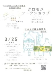 2026年 3月 3日 【高畠町】町立図書館企画展「東日本大震災、防災特集」 会場: このイベントを見る 2026年 3月 25日 クロモジワークショップ 会場: ✿ 山形県への避難家庭を対象とするストレスケア事業 ✿ 昨年も大好評だった、クロモジを使ったワークショップ… このイベントを見る
