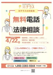 2026年 4月 22日 法テラス 無料電話法律相談 会場: 経済的にお困りの方を対象に無料の法律相談会を開催します。 収入や資産(現金・預貯金)が一定基準以下の方が対象です。 ご予… このイベントを見る