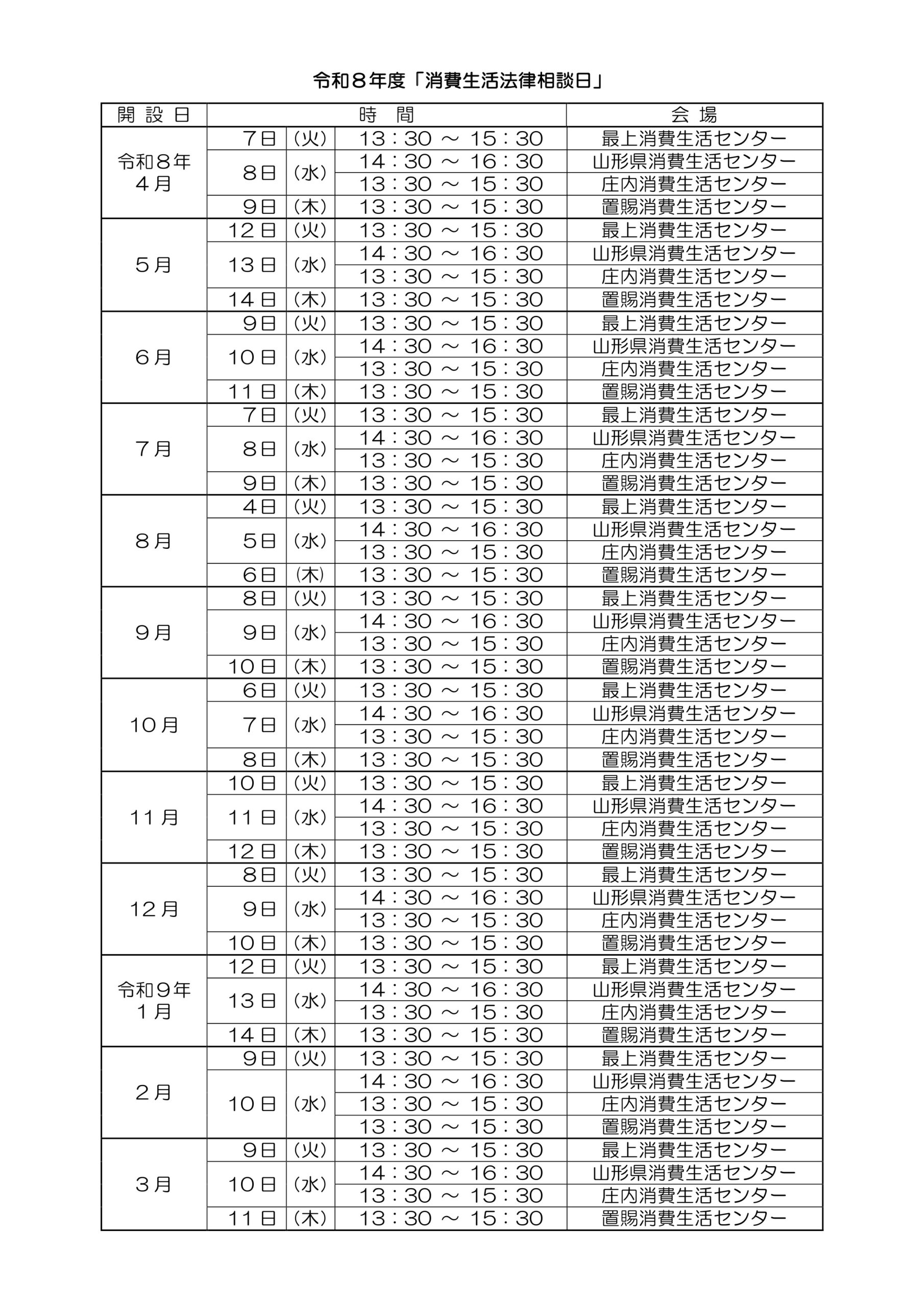 最上・庄内・置賜消費生活センターは午後1時30分から午後3時30分となります。